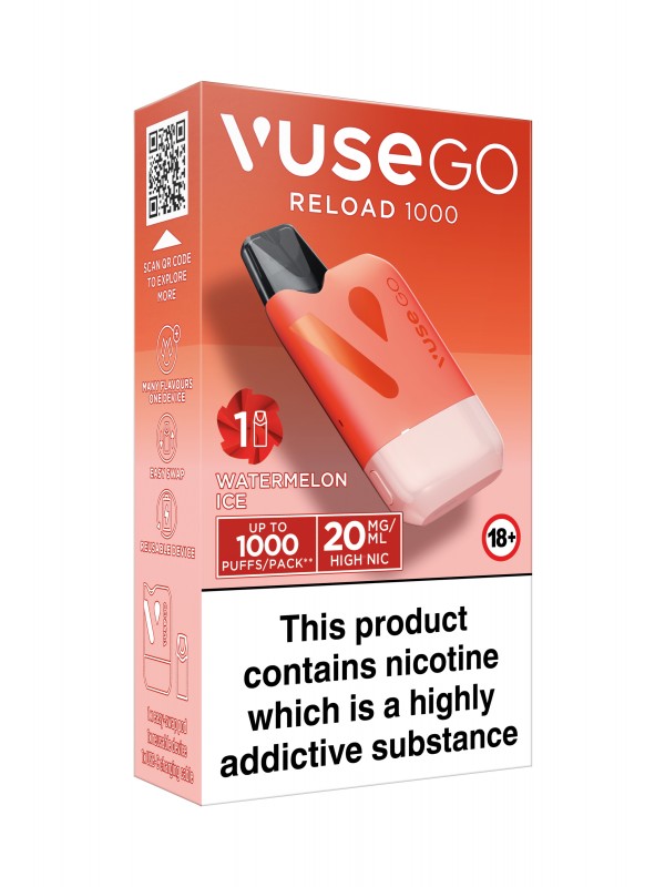 Vuse GO RELOAD 1000 is our latest rechargeable device featuring a compact pocket size design with a premium and modern finish. It allows users to easily swap their flavour pods when they wish to change. VUSE GO RELOAD Starter Kit comes with a Watermelon Ice pod pre-loaded in the device, so it is ‘ready to vape’. VUSE GO RELOAD gives up to 1000* puffs per pod and uses ceramic heating technology to give a greater sensorial flavour experience. VUSE GO RELOAD is compatible with all Vuse Pods.
